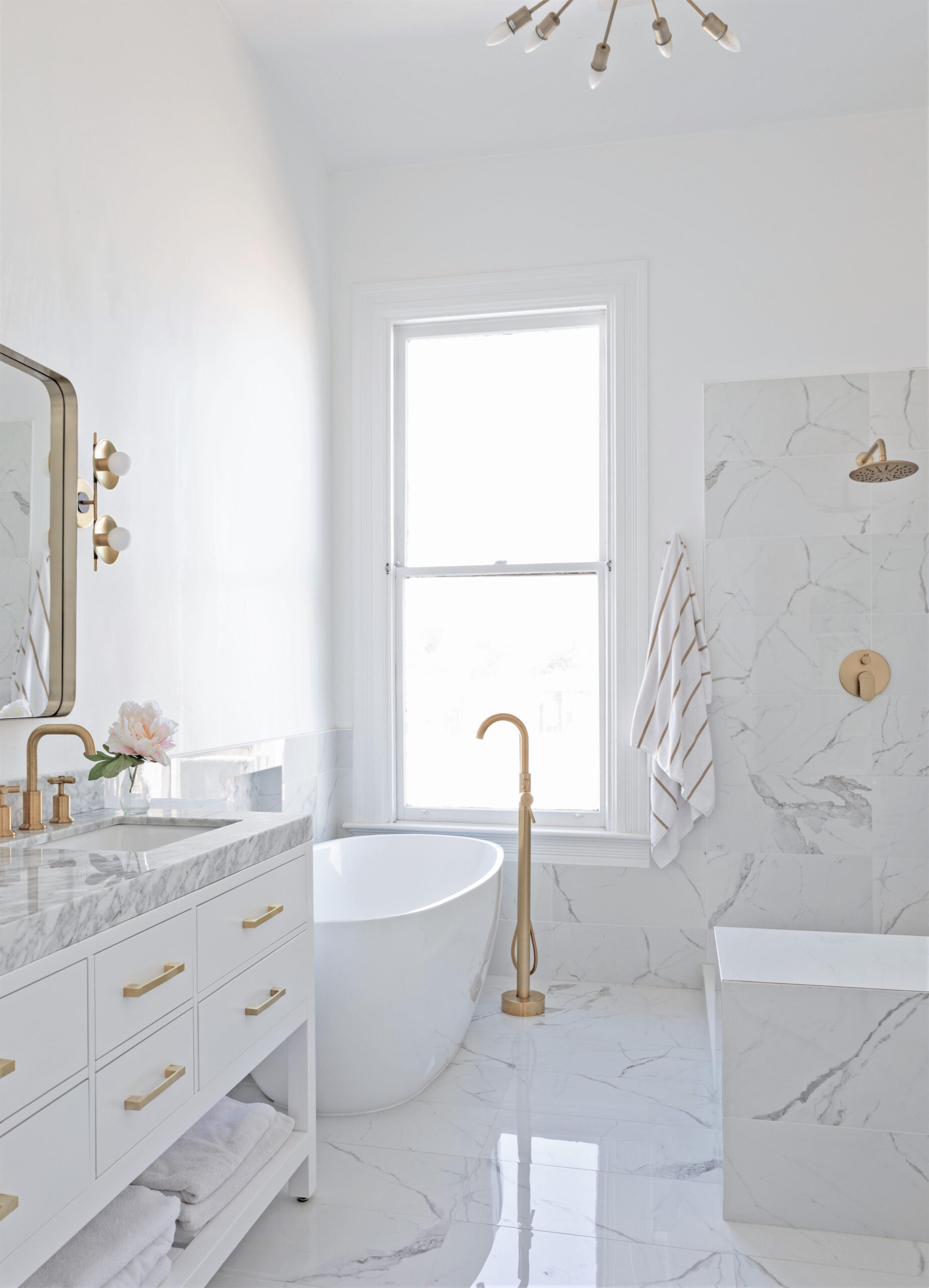 Install lighting fixtures, including overhead lights, vanity lights, and any other decorative lighting. the vent cover and finishes are installed in this phase too.