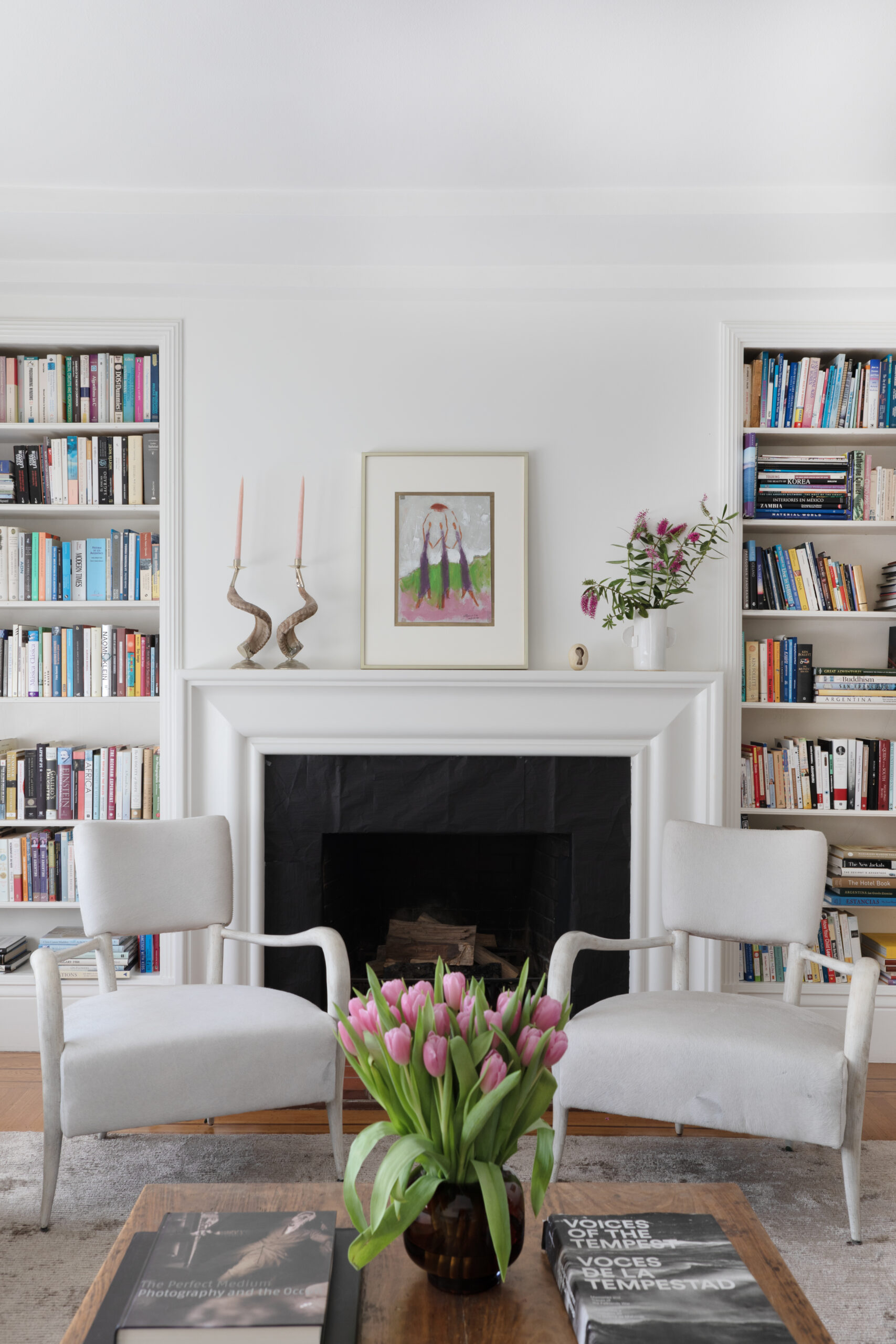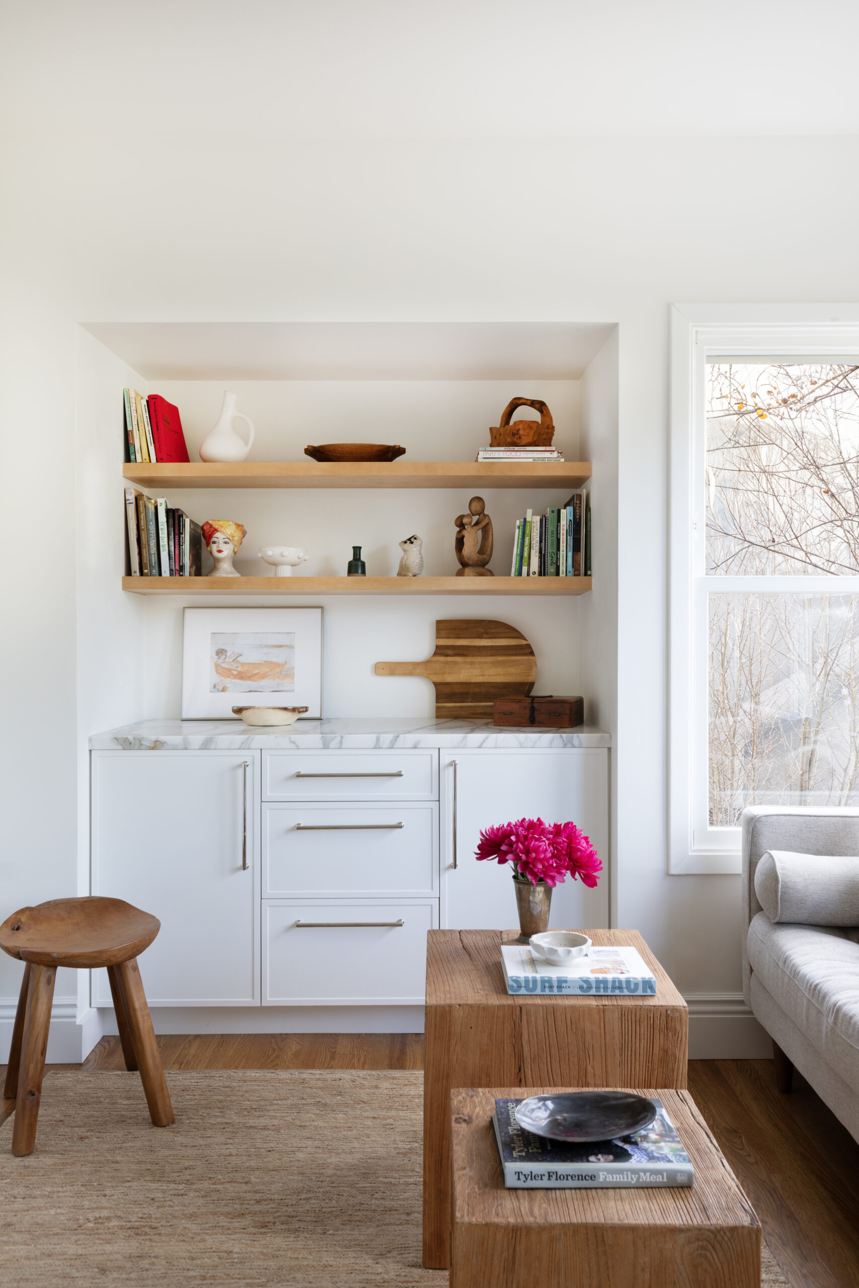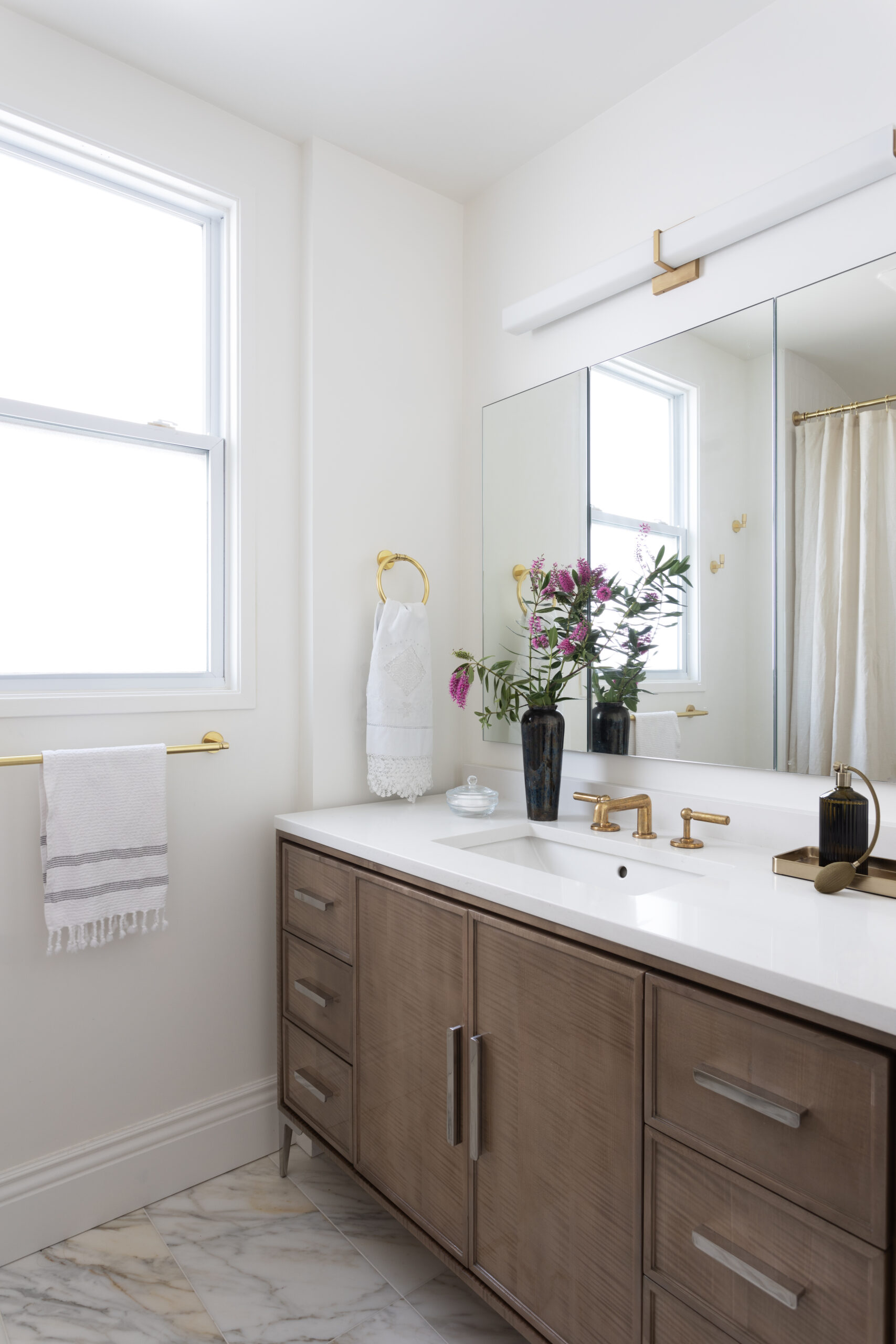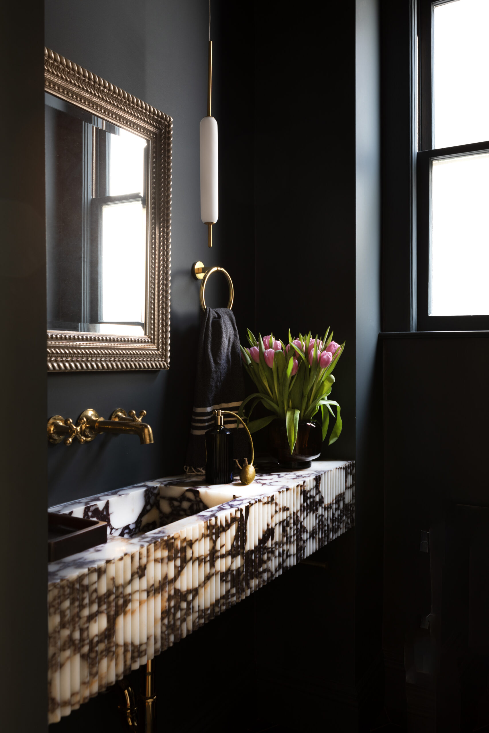 The powder room was reconfigured and features a bespoke marble fluted vanity. We incorporated the client's existing furniture and art with new pieces to preserve the client's taste and vision. The house needed electrical and plumbing updating and structural work throughout.