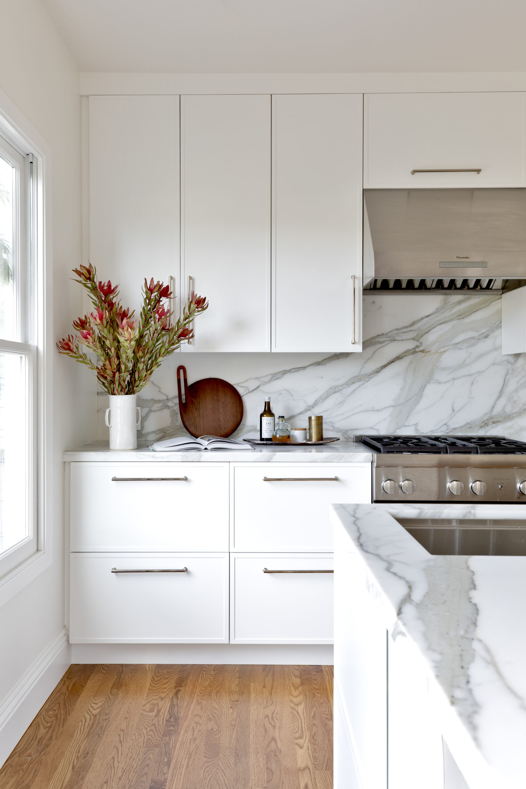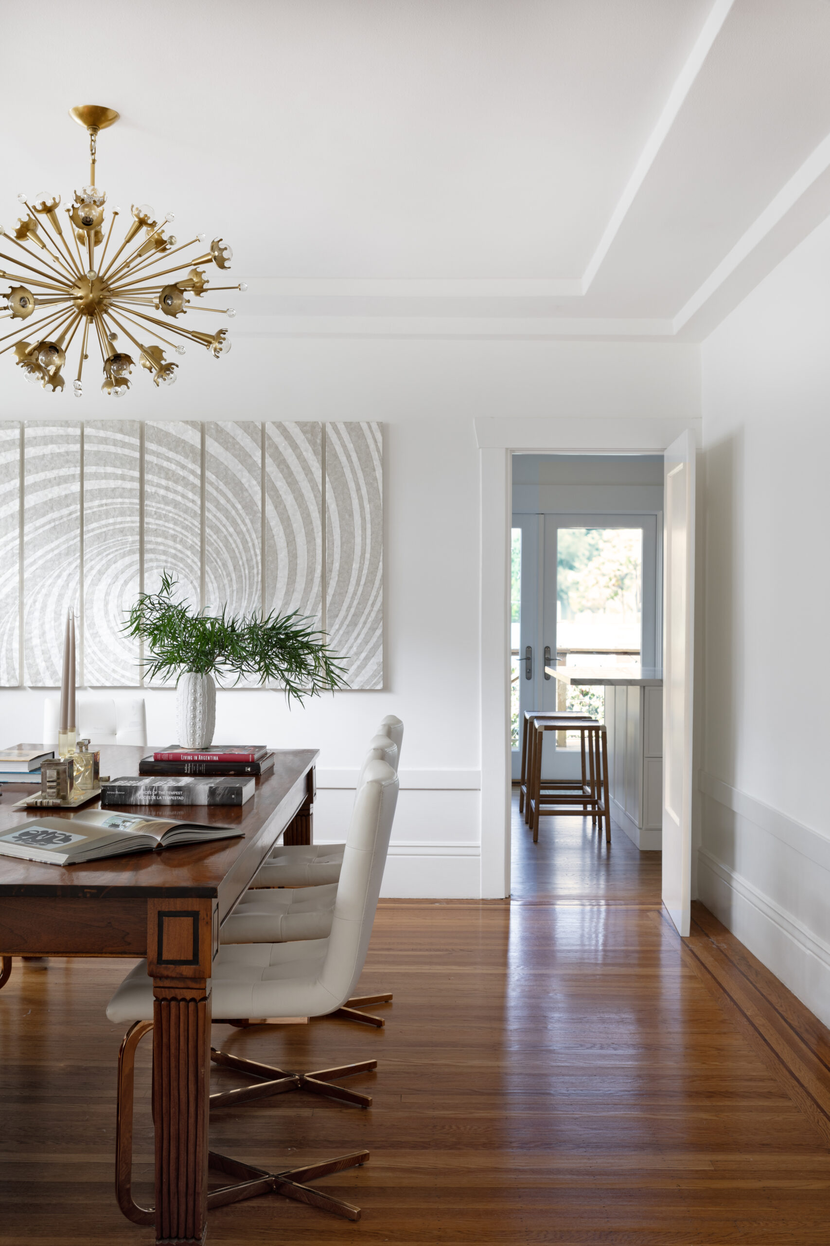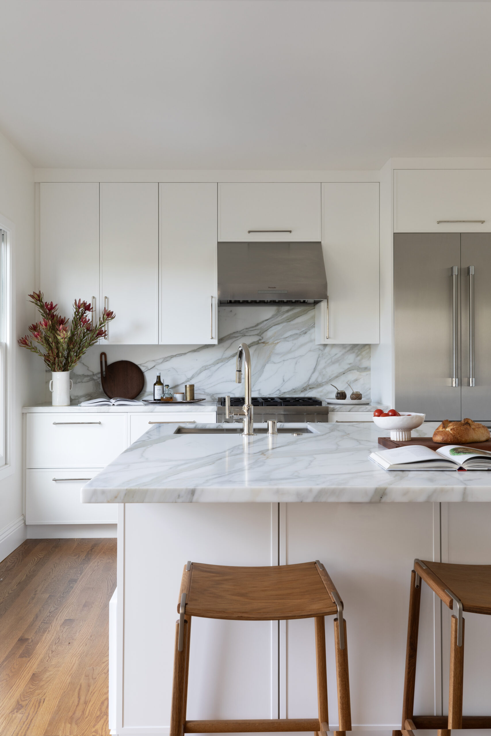 An original Arts and Crafts home in San Francisco underwent a comprehensive kitchen and bathrooms renovation by Soledad Alzaga Interior Design to enhance flow and functionality, updating every surface with custom kitchen cabinets and finishes. We removed a wall to incorporate a separate office into the kitchen, added a central island perfect for food prep and entertaining.