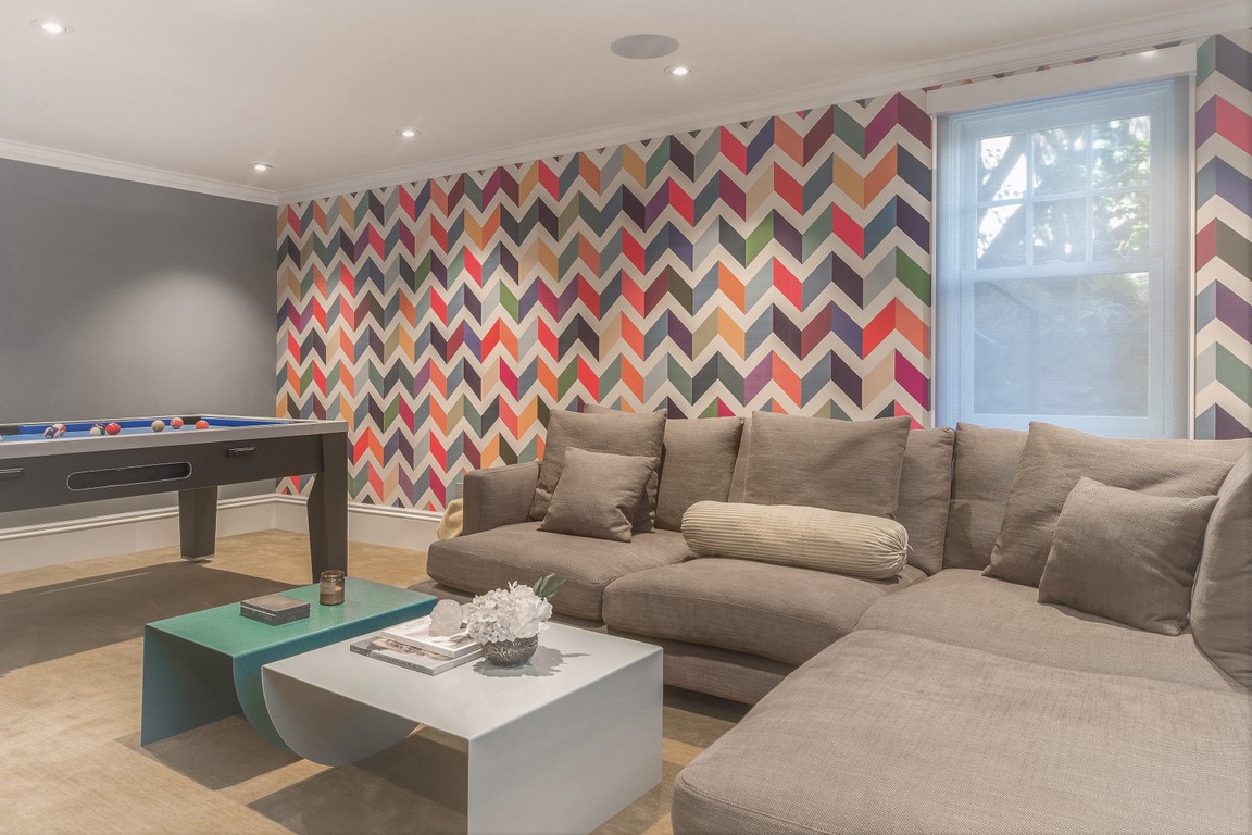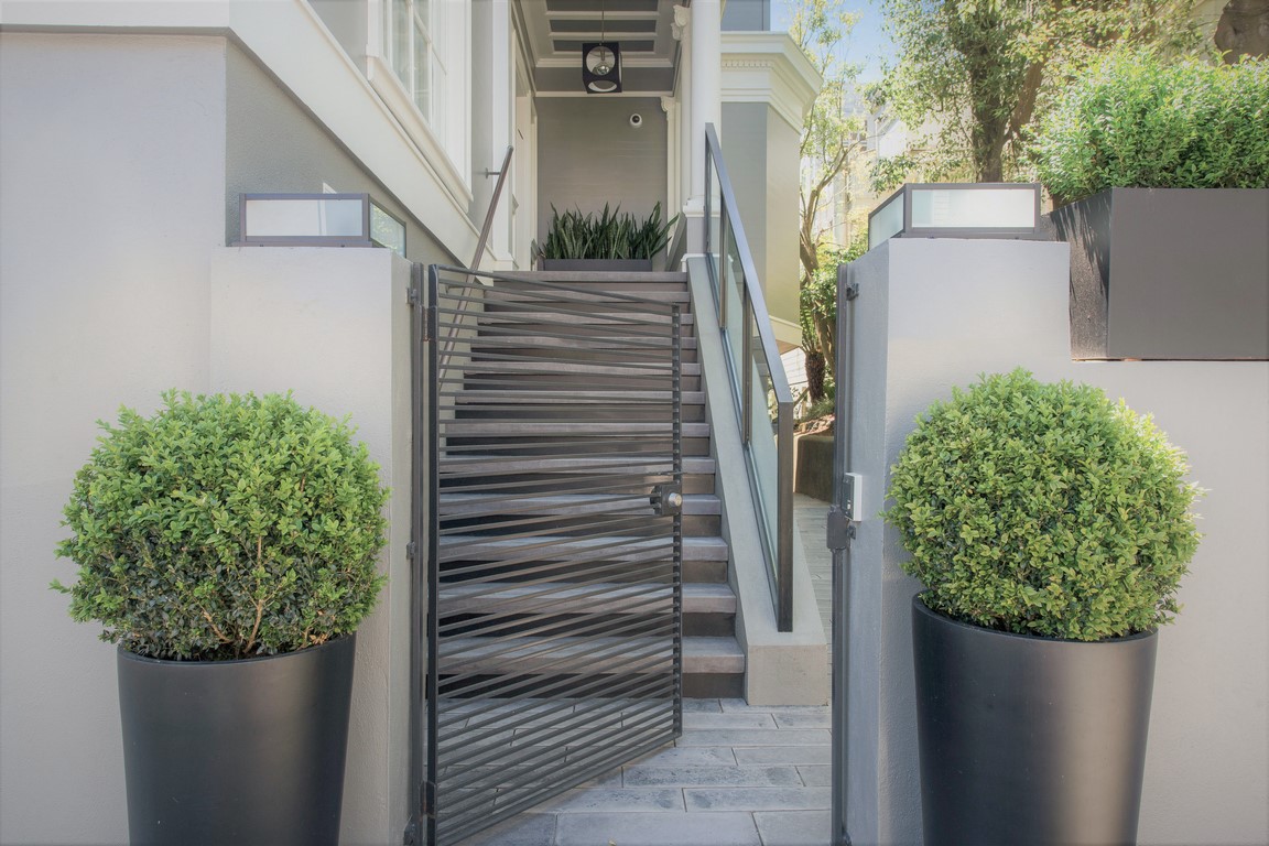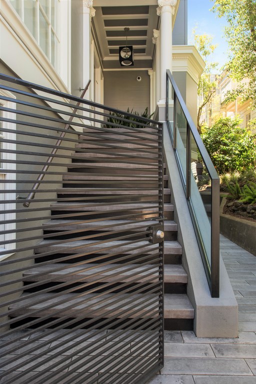 A Pacific Heights home required the addition of a new playroom, TV room, entertainment area, guest room, bathroom, and laundry room on the lower level floor. Soledad Alzaga Interior Design redesigned and remodeled the space, incorporating a pool table and bespoke built-in furniture in the guest room. We sourced a custom wallpaper mural and coffee tables from Europe. The exterior needed a refresh, with new poured cement stairs, Moroccan hand-painted tiles in the landing, and new lighting fixture. The gate and banister were custom-made of iron by a local artisan, adding a modern touch to the overall design.